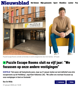 Sinds 1 februari sloten we onze deuren en werden onze escape rooms overgenomen door Exit Games. Zij openen de deuren opnieuw, met vernieuwde escape rooms, op 20 maart. Ga naar www.exitgames.be om jullie plekje te reserveren! Veel plezier!